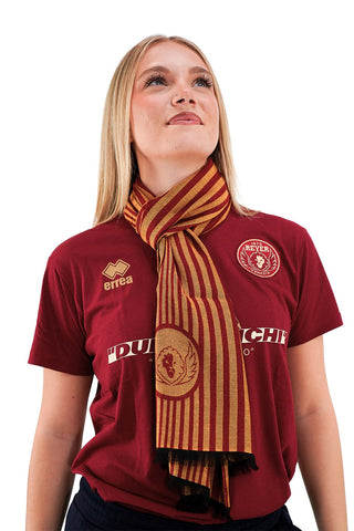 La stola Reyer a strisce verticali nei colori orogranata è un accessorio distintivo per i veri tifosi e per chi ama un look sofisticato, di impatto visivo immediato e con un tocco di classe dato dal Leone intessuto su entrambe le estremità. Interamente Made in Italy, morbida al tatto, leggera e piacevole da indossare al palazzetto o in ogni occasione.
